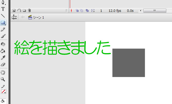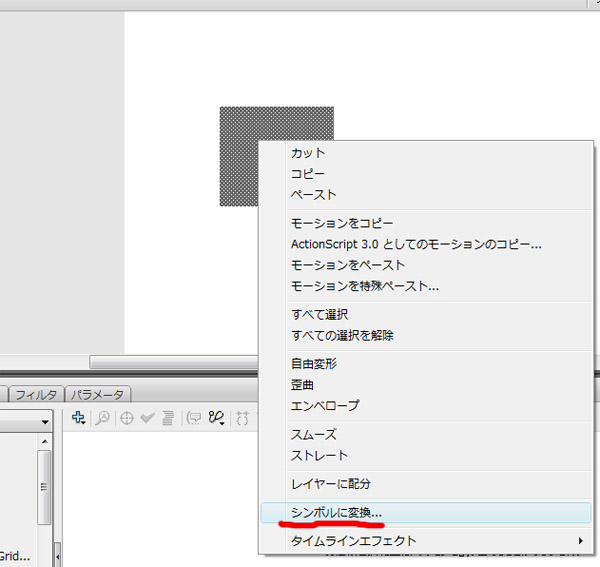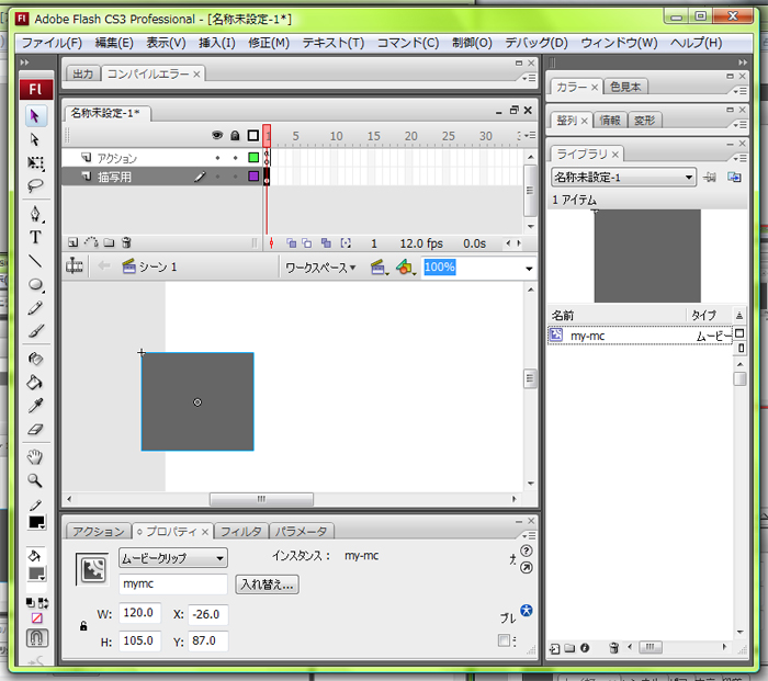 Flashで描いたイメージやグラフィックシンボルをアクションスクリプトなどでコントロールしたいときは、そのグラフィックシンボルをシンボル化し、そしてステージにインスタンスとして配置することが必要です。