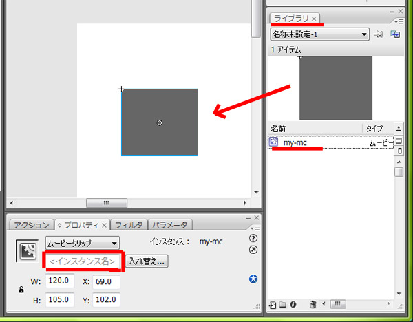 ステージに配置したインスタンスにインスタンス名mymcを設定します。