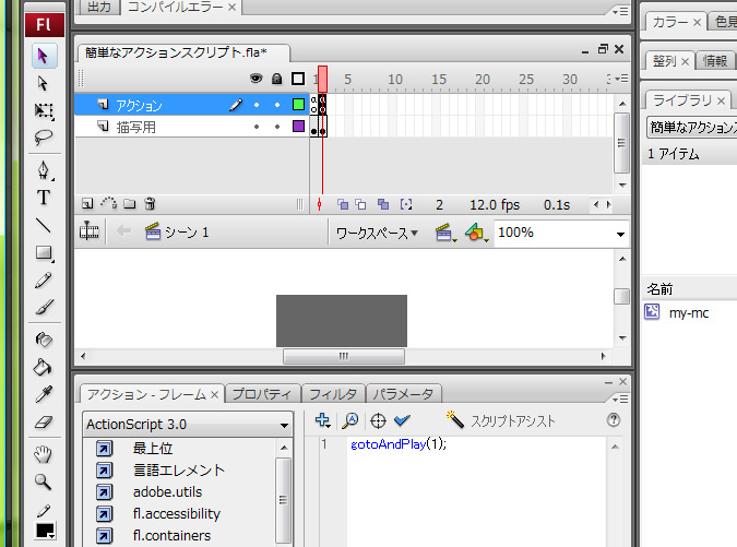 では、このスクリプトを連続で実行するためにgotoAndPlay()というメゾットを使ってみましょう。